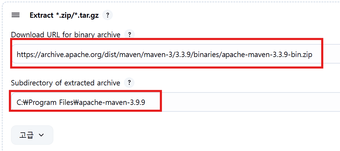 Subdirectory of extracted archive (추출 파일의 하위 디렉터리): 다운로드 파일의 압축 해제 폴더 내에 메이븐 설치 디렉터리 이름을 입력