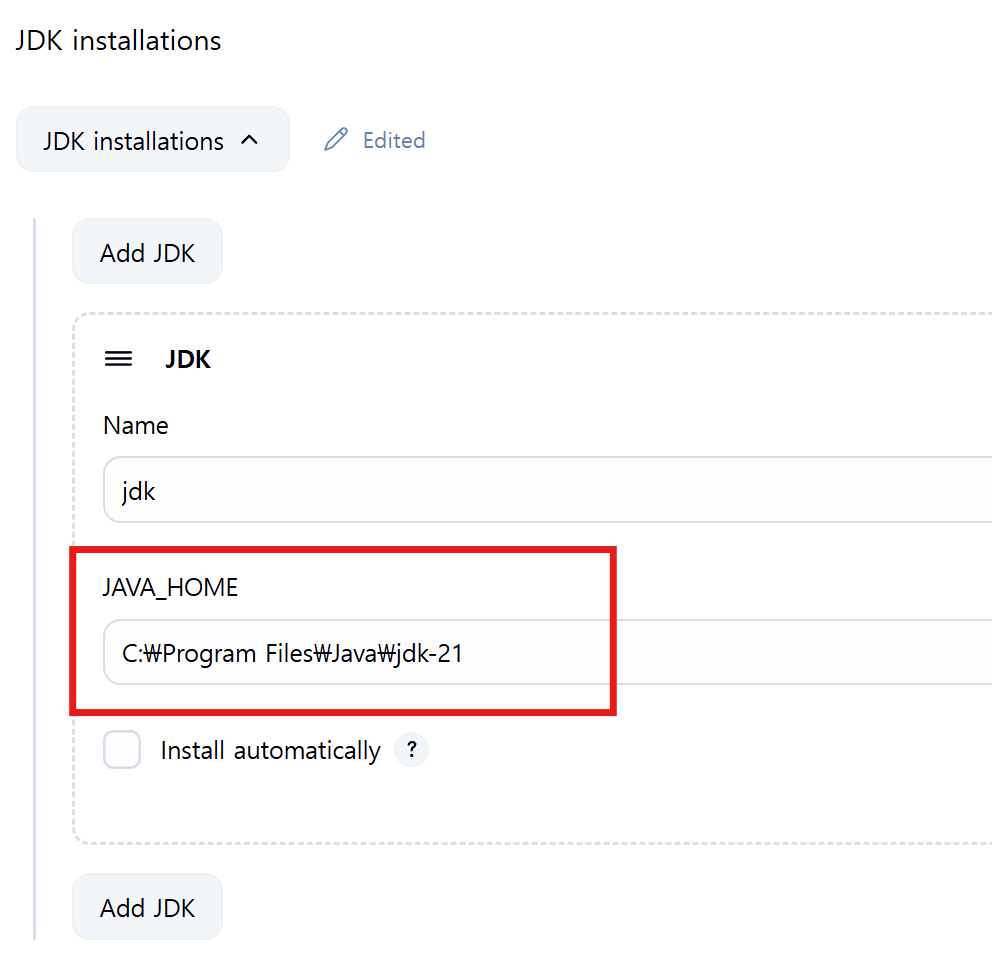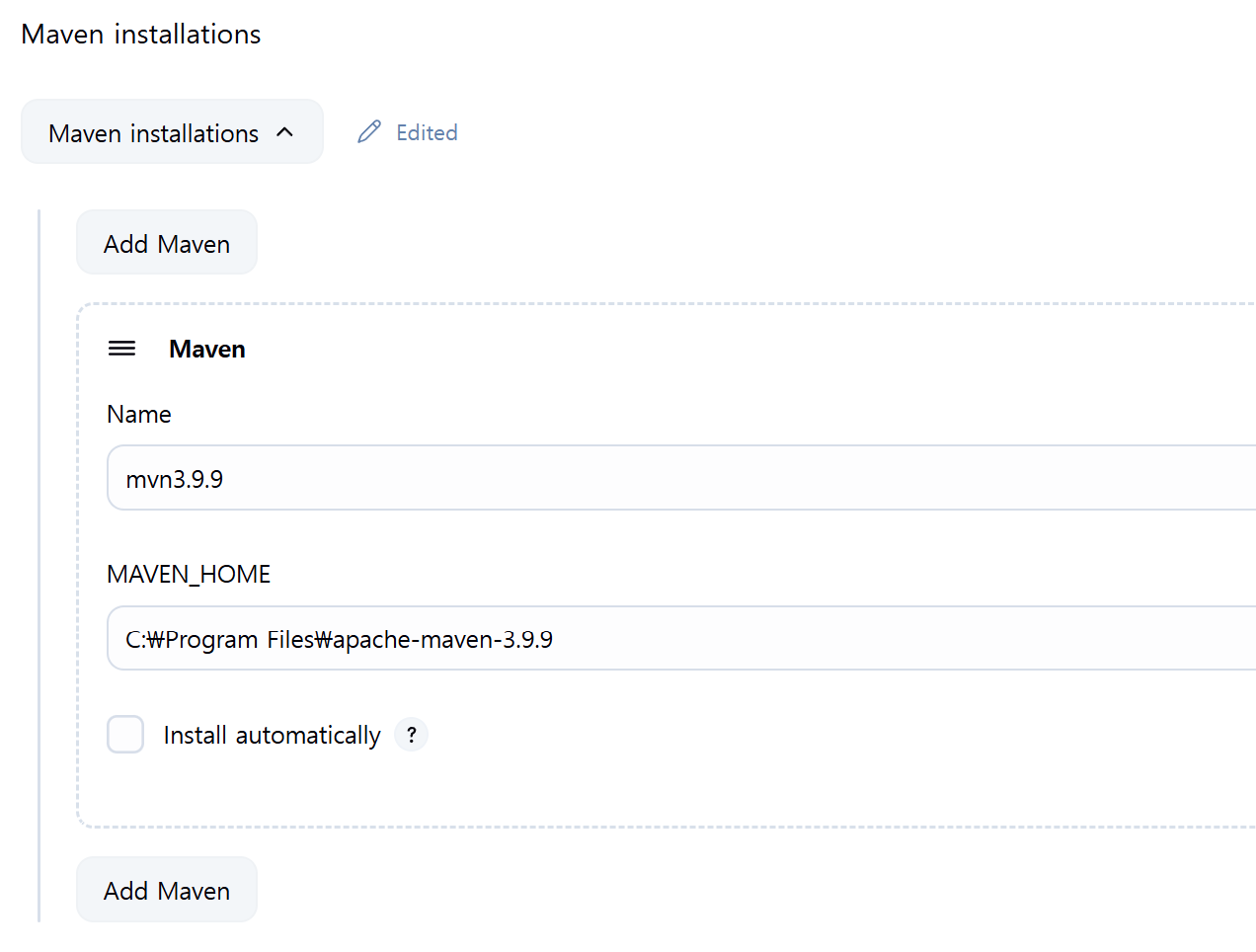 만약, 젠킨스 작업을 운영 중인 시스템에 이미 메이븐이 설치되어 있다면 Install automatically 자동설치 체크박스를 해제한다.