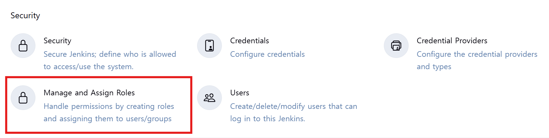 • 권한을 생성하려면 'Role-based Authorization Strategy'(역할-기반 권한 부여 전략)플러그인 설치해야한다.