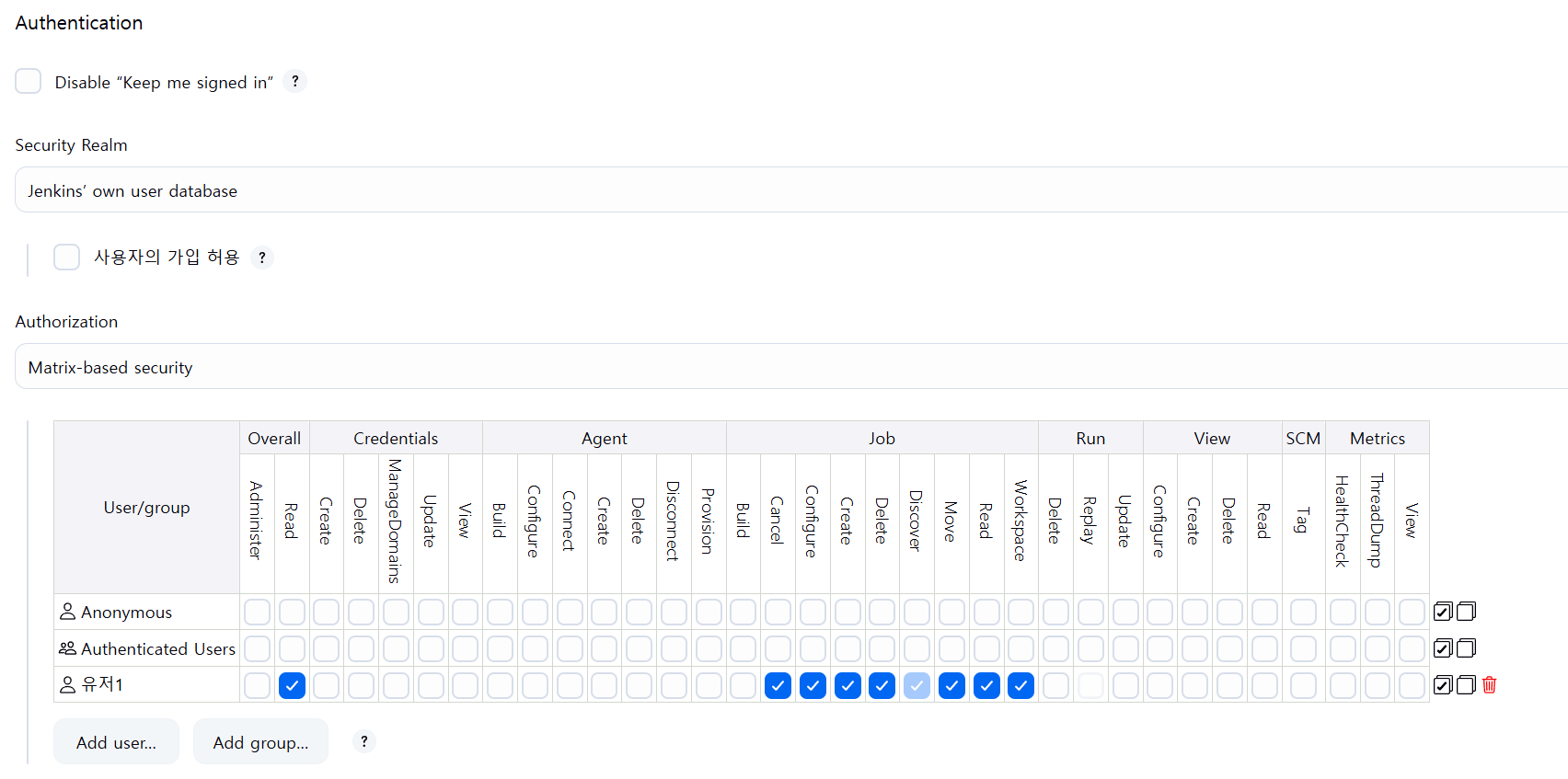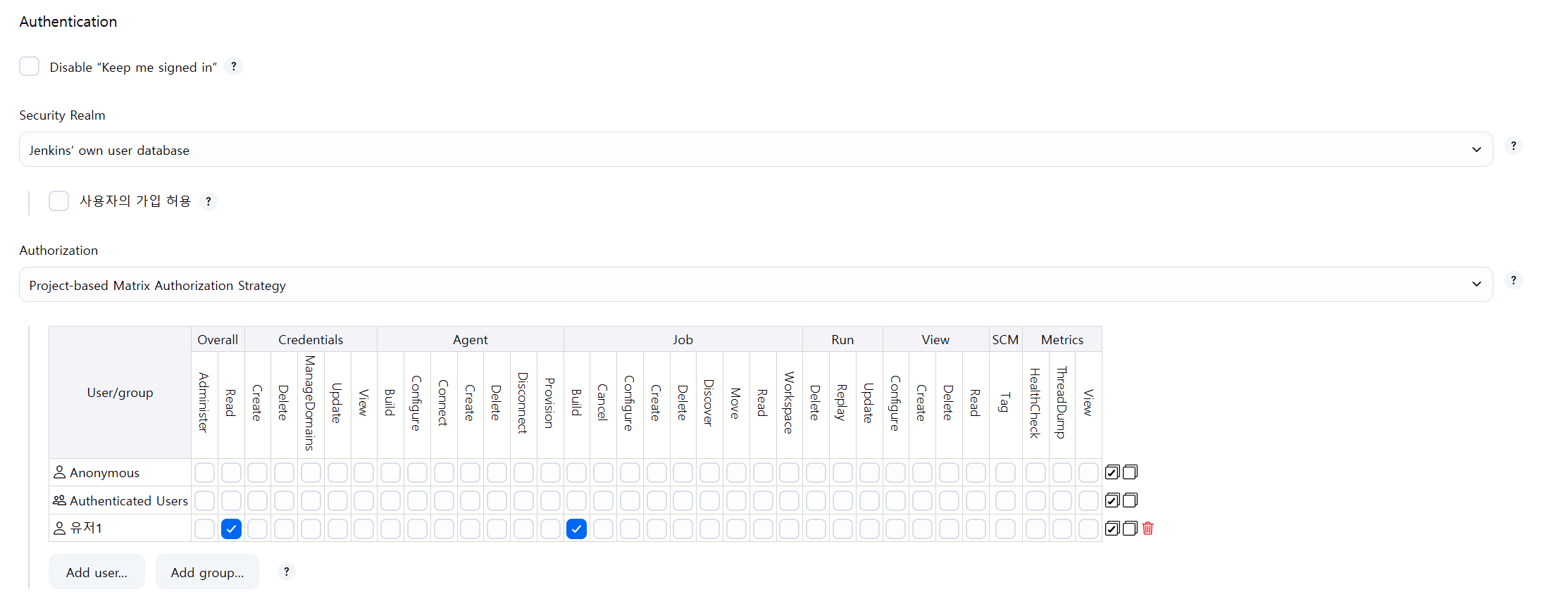 • Authenticated Users(등록 사용자) : 젠킨스 시스템에서 인증된 모든 사용자