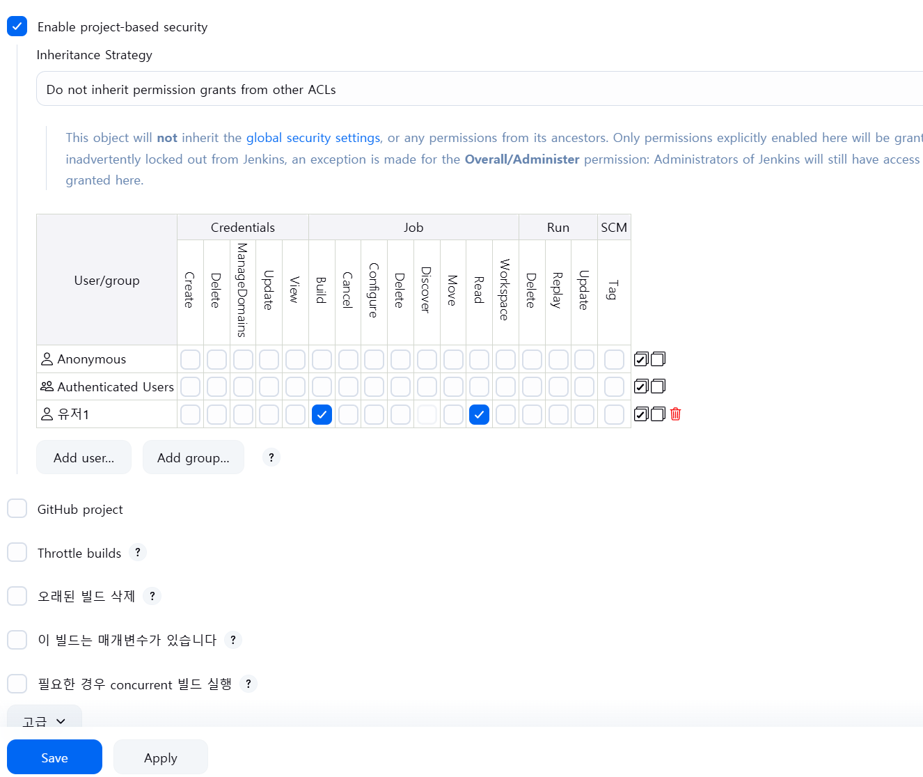 Do not inherit permission grants from other ACLs을 선택하고 user1에게 build와 read 권한을 부여한다.