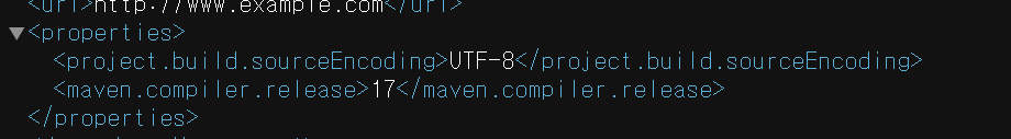 • <properties></properties> 속성 섹션에서는 JAVA 파일을 컴파일할때 필요한 텍스트 인코딩 및 자바 버전등 속성을 알수있다.