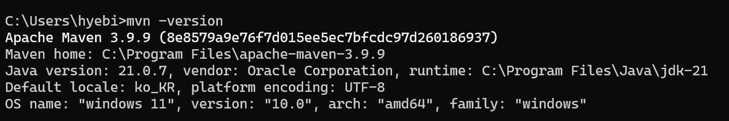 3. cmd에서 다음 명령어를 입력하여 다음과 같이 maven 버전정보가 출력되면 정상 설치된 것