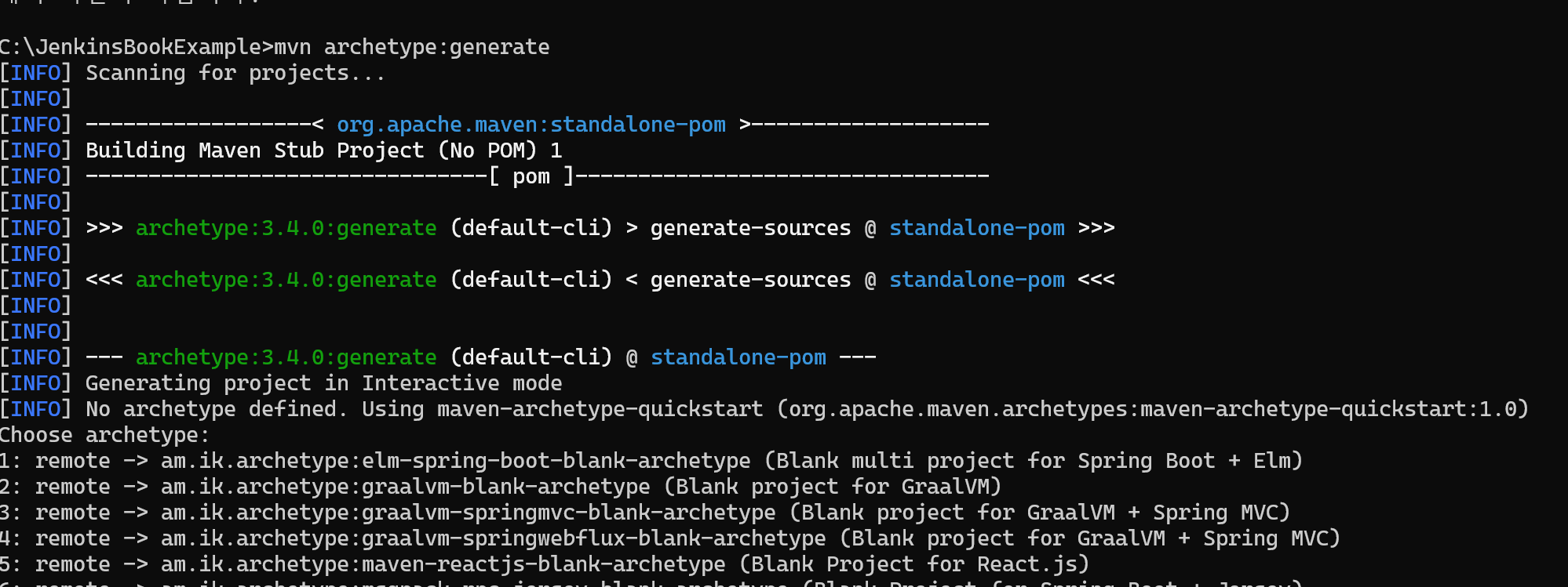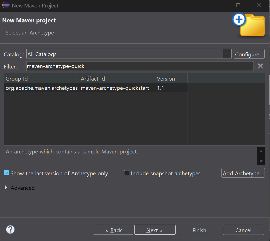 • 2-4. 웹애플리케이션을 개발하는 경우 디렉터리 구조를 생성하는 maven-archetype-webapp이 필요하지만, 지금은 간단한 자바 API프로젝트를 생성하므로 maven-archetype-quick 플러그인을 사용한다.