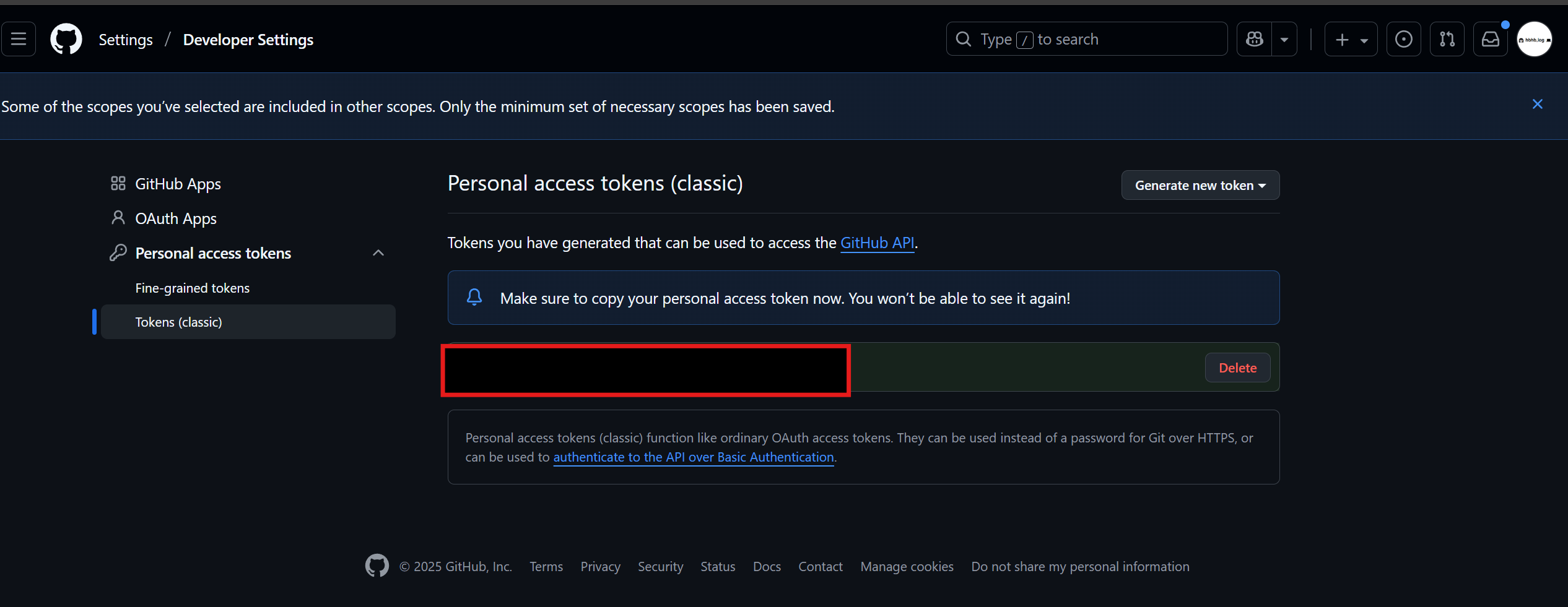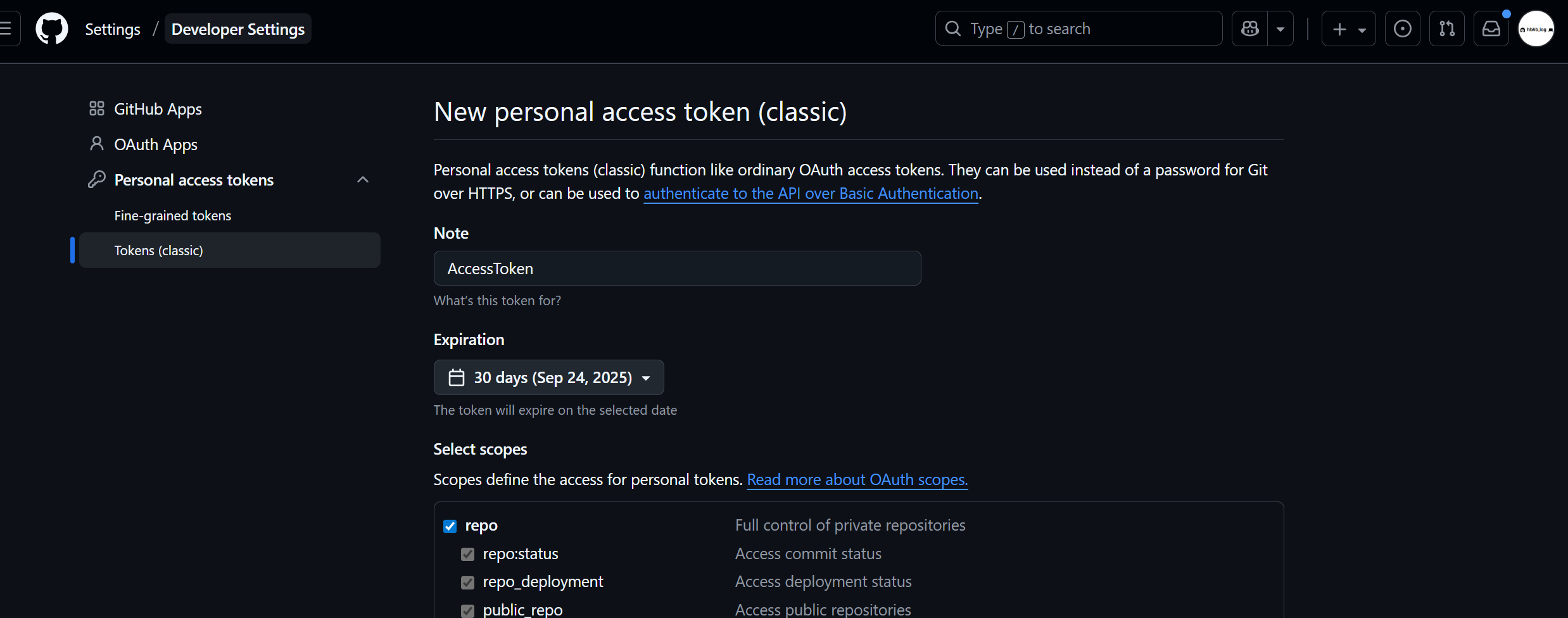 2단계 : API 액세스 토큰 생성 : 대시보드 오른쪽 상단 사용자 아이콘 → Settings 메뉴 선택 → 설정페이지에서 Developer Settings 클릭 → 깃허브 Apps 페이지 → Personal aceess tokens → Tokens > Generate new Token → Generate new Token (classic)