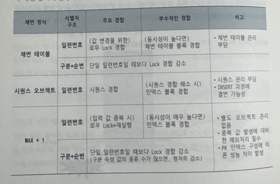 - 다중 트랜잭션에 의한 동시 채번이 많고 PK 구분 속성에 값 종류 개수가 적으면, MAX+1 방식은 성능에 문제가 생길 수 있다. 그럴 때 순환 옵션을 가진 시퀀스 오브젝트 활용을 고려할 수 있다.